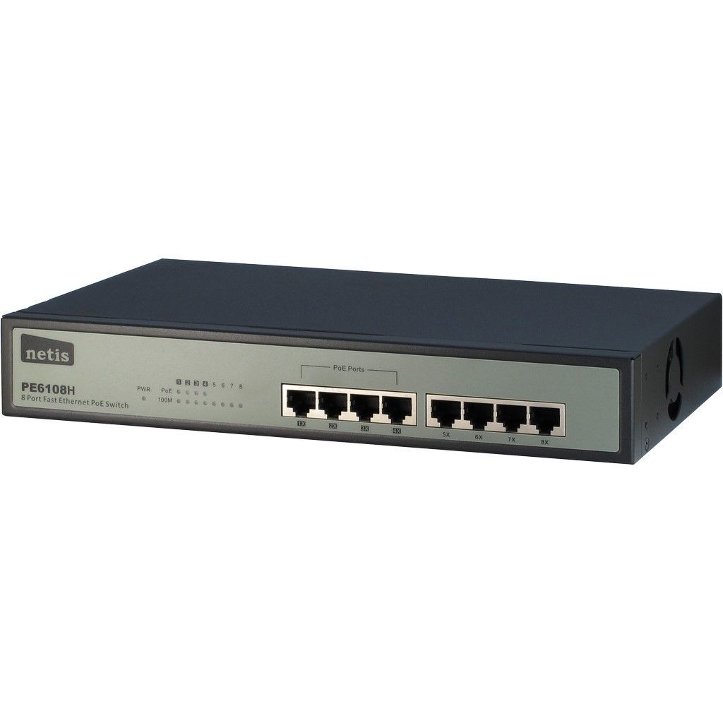 Der Netis PE6108H ist ein 8 Port Fast Ethernet PoE‐Switch, der auf den Ports 1-4 PoE Geräte wie IP-Telefone, Kameras und nachgeschaltete Switches nach dem 802.3af-Standard mit Strom versorgen kann. Dies erlaubt den Einsatz von PoE-Geräten ohne ein zusätzliches Netzteil.